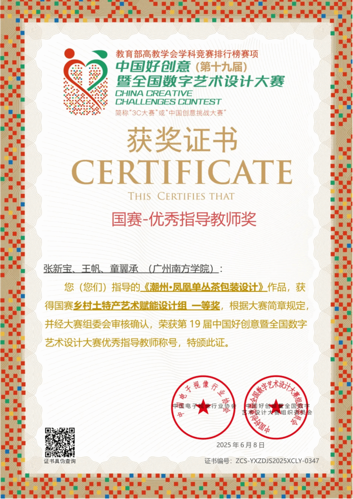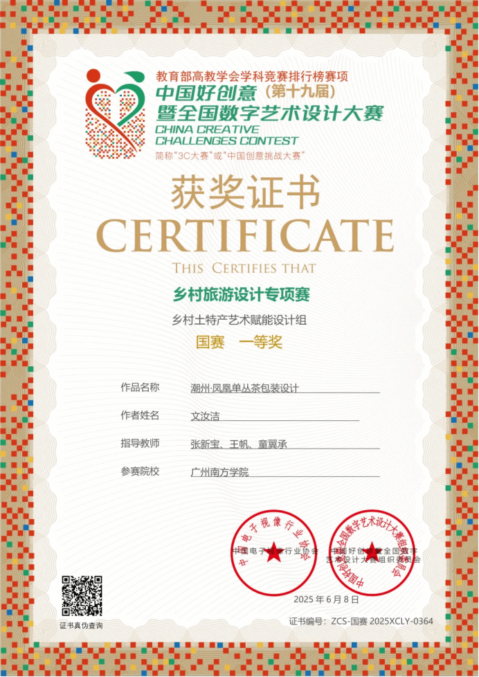 在本次大赛中,太阳成集团tyc234cc主页2022级专升本网络与新媒体专业文汝洁同学凭借作品《潮州凤凰单丛茶包装设计》在2000多所高校投出12000多件有效作品中,斩获国家级一等奖;张新宝老师、王帆老师、童翼承老师荣获“优秀指导教师”称号。