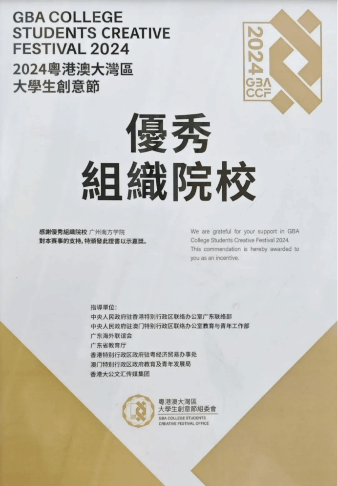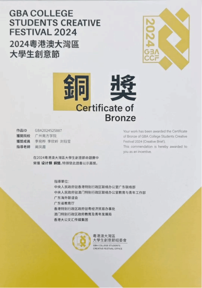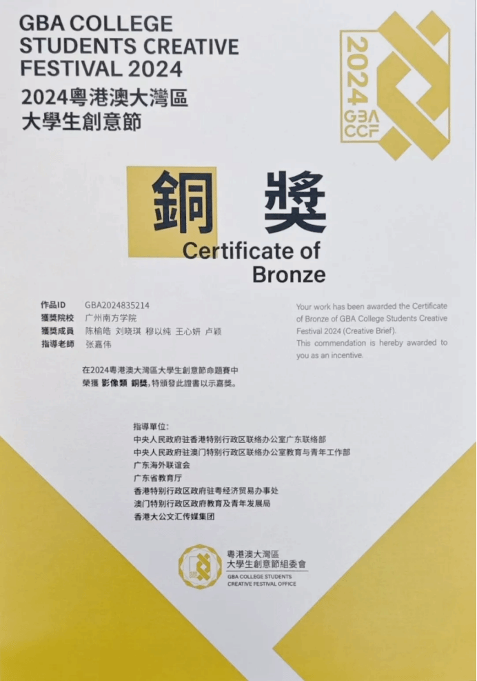 由阚凤霞副教授指导的作品荣获命题赛设计类铜奖,团队成员包括李宛桦、李欣岭和刘钰莹;张嘉伟老师指导的作品获得命题赛影像类铜奖,团队成员为陈榆皓、刘晓琪、穆以纯、王心妍和卢颖。此外,我集团因组织工作出色,获得“优秀组织院校”奖。12月29日,由张嘉伟老师带队前往清远参加湾创节颁奖典礼,领取奖项。