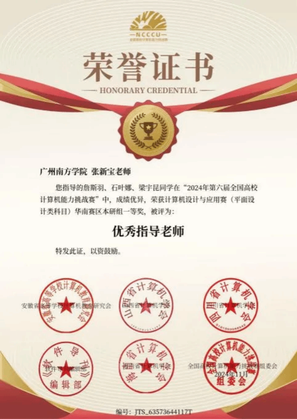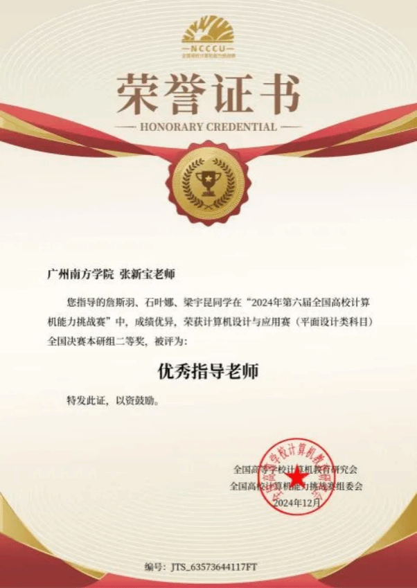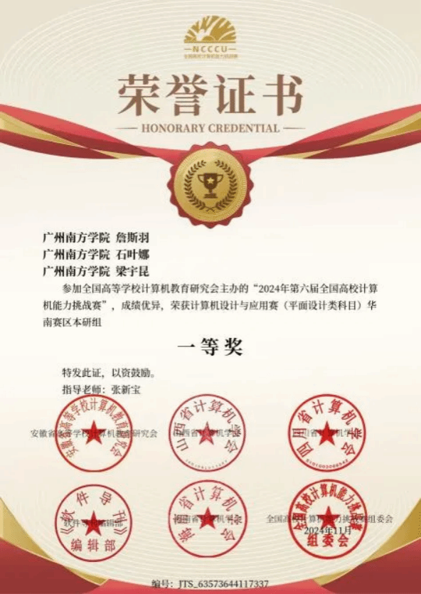 2024年11月,由全国高等学校计算机教育研究会主办的“2024年第六届全国高校计算机能力挑战赛”中,我集团22级专升本网络与新媒体专业的詹斯羽、石叶娜、梁宇昆在指导老师张新宝的悉心指导下,于计算机设计与应用赛(平面设计类科目)全国决赛本研组激烈角逐中脱颖而出,凭借卓越创意和精湛技艺荣获华南赛区本研组一等奖。12月,他们再度参赛,继续展现出色实力,在同一赛事的全国决赛本研组中荣获二等奖。