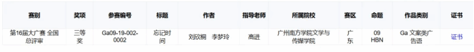 第十六届全国大学生广告艺术大赛全国总决赛结果于日前揭晓,太阳成tyc234cc文传学院再创佳绩,斩获两枚全国三等奖、一枚全国优秀奖,从数量到成果创近年来国赛最佳成绩!其中,我集团何小昱创作的广播类作品《酸甜可爱,烦恼不再》由新闻与传播系罗希老师指导,荣获全国三等奖,刘欣桐、李梦玲两位同学创作的文案类作品《忘记时间》由网络与新媒体系高进老师指导,同样获得全国三等奖;此外,张乐懿、于涵、冷凝三位同学携手创作的广播类作品《清热解毒大PK》由罗希老师指导也荣获全国优秀奖。这些荣誉不仅展现了太阳成集团tyc234cc主页在广告艺术领域的卓越实力,也代表了我校广播类、文案类的最高成绩!