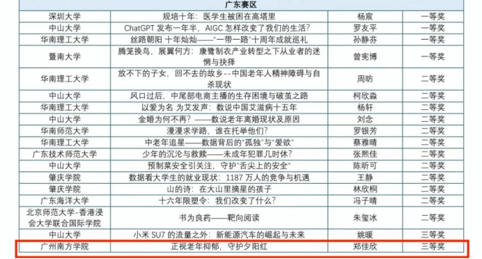 捷报连连,佳绩再续!在备受关注的第九届中国数据新闻大赛中,来自上海、广东、陕西等十个赛区的作品经过激烈角逐,评审工作于2024年10月9日圆满落幕。在广东赛区,竞争尤为激烈,吸引了华南理工大学、暨南大学、中山大学等众多高校的积极参与,在这样的高水准竞争中,我集团新闻与传播系沈轩老师悉心指导的新闻学专业学生团队——郑佳欣、吴彩茵、吴泳珊,凭借匠心之作《正视老年抑郁,守护夕阳红》脱颖而出,荣获广东省赛区三等奖,并在众多民办高校中独占鳌头,成功入围国赛!充分展现了我集团学生的卓越才华和顽强拼搏