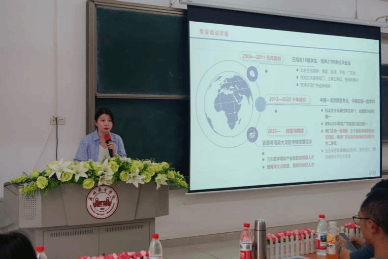 会议伊始,陈珂老师从专业概况入手,结合我集团师生共同摄制的新闻学招生宣传片,生动阐释了本专业的教学特色与发展前景。她介绍,我集团新闻学专业定位于培养面向粤港澳大湾区、适配数字化传媒产业发展的应用型传播人才。专业师资力量雄厚,课程体系完善,教学注重实践实训。设有应用新闻传播、数字影像传播、品牌传播三个特色模块,同学们可根据自身兴趣与职业规划灵活选择。同时,陈珂老师还分享了优秀校友的成长案例,他们在传统媒体、新媒体等多个领域发光发热,成为行业砥柱。