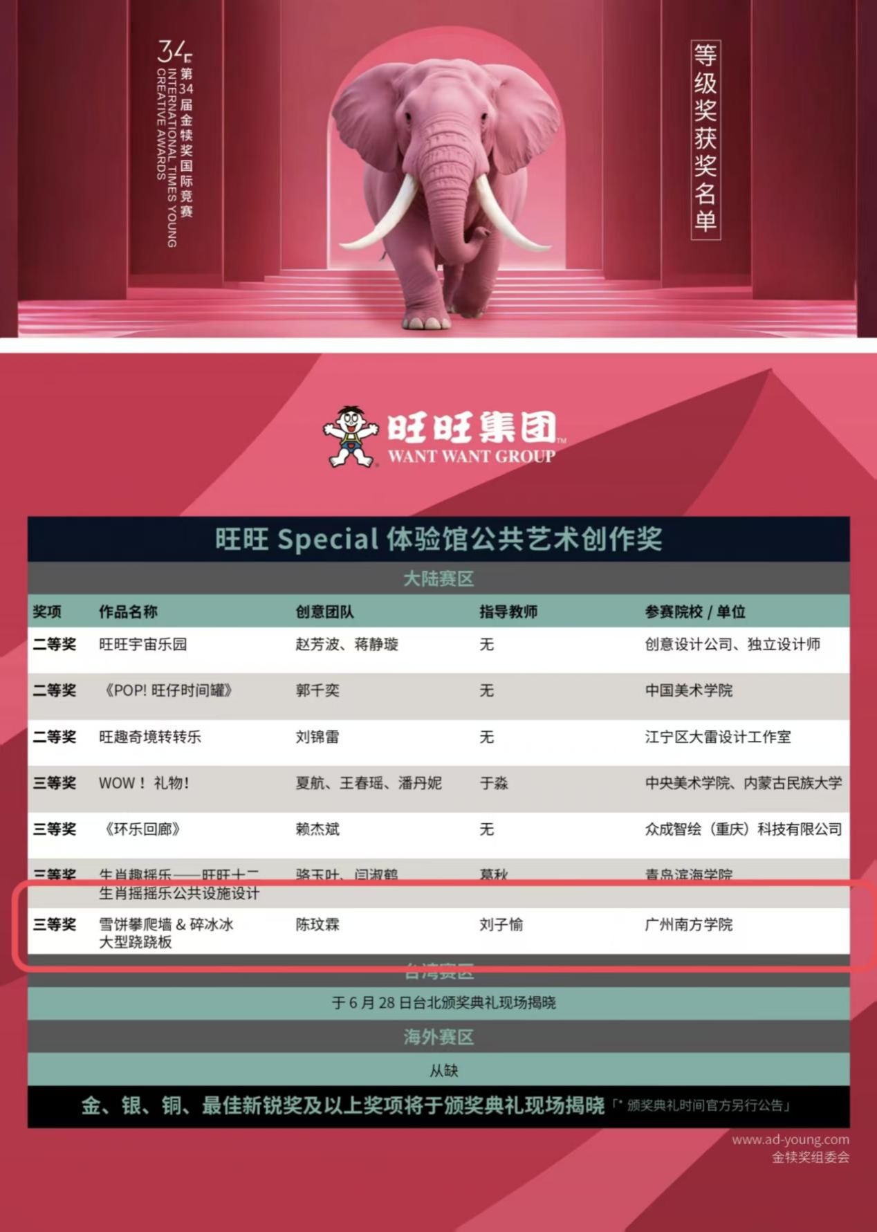 在“第34届金犊奖国际竞赛”中,我集团新闻与传播系刘子愉老师指导学生陈玟霖的作品《雪饼攀爬墙&碎冰冰大型跷跷板》获得旺旺Special体验馆公共艺术创作奖国家级三等奖。