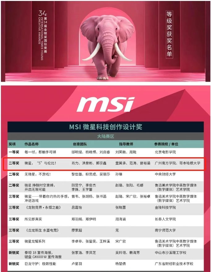 在“第34届金犊奖国际竞赛”中,我集团网络与新媒体系童翼承老师指导学生团队(肖力、洪泉彬)的作品《微星,“5”与伦比!》获得MSI微星科技创作设计奖国家级二等奖。