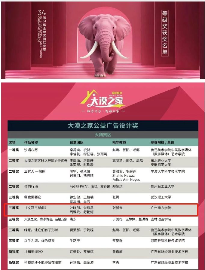 在“第34届金犊奖国际竞赛”中,我集团网络与新媒体系张新宝老师指导学生团队(叶晓彤、朱燕凤、周雅云、舒艳妮)的作品《文冠三部曲》获得大漠之家公益广告设计奖国家级三等奖。该比赛是教育部认定的大学生竞赛榜单目录上的赛事。